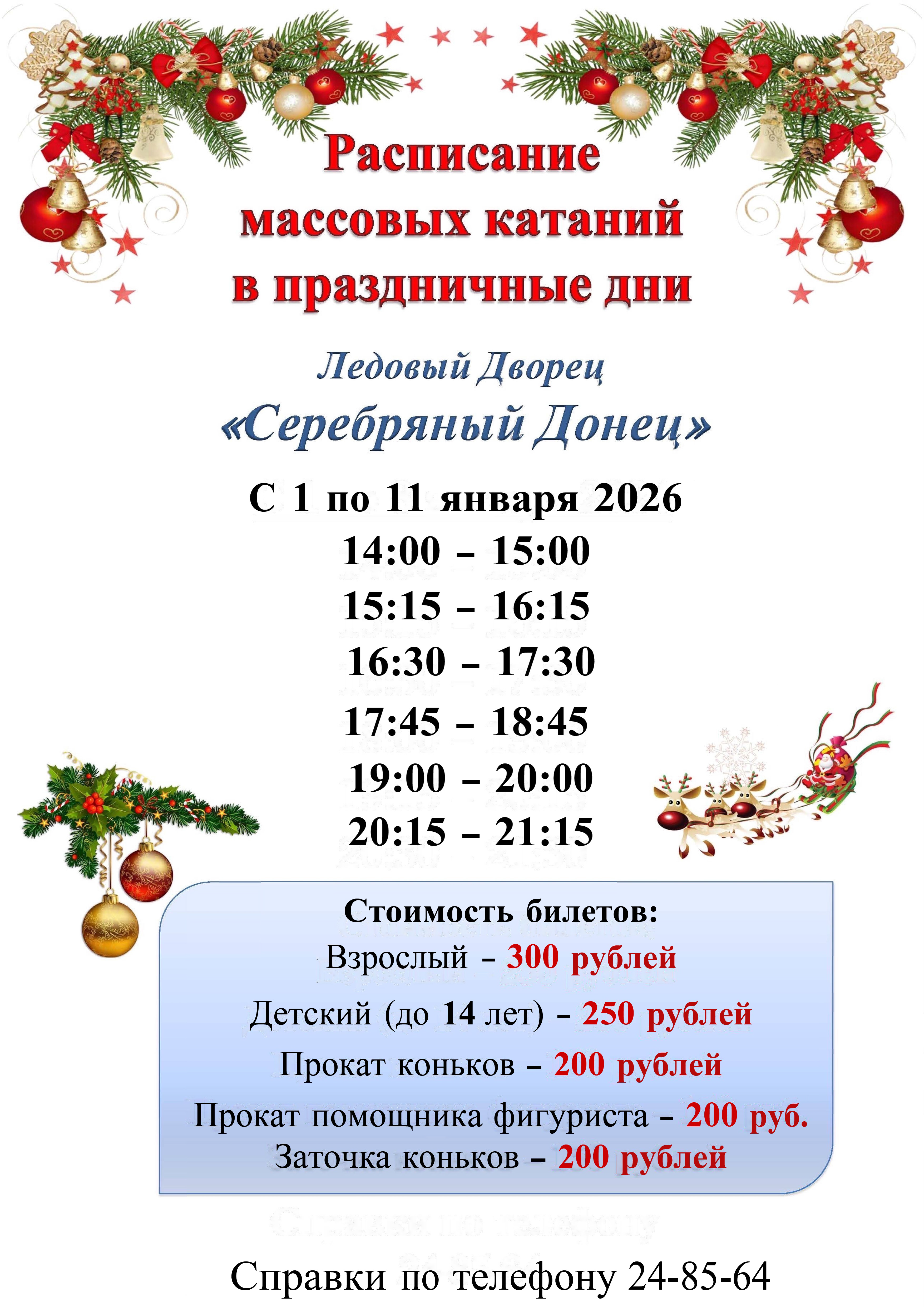 Ледовый дворец «Серебряный Донец» Расписание сеансов катания г. Белгород, ул.Корочанская,39-и Прейскурант тарифа на платные услуги с 20.12.2025 Правила поведения на массовых катаниях.
